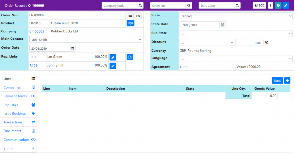 And above we can see the stand Order Line Record. From here we can click on the stand Item and modify it further.